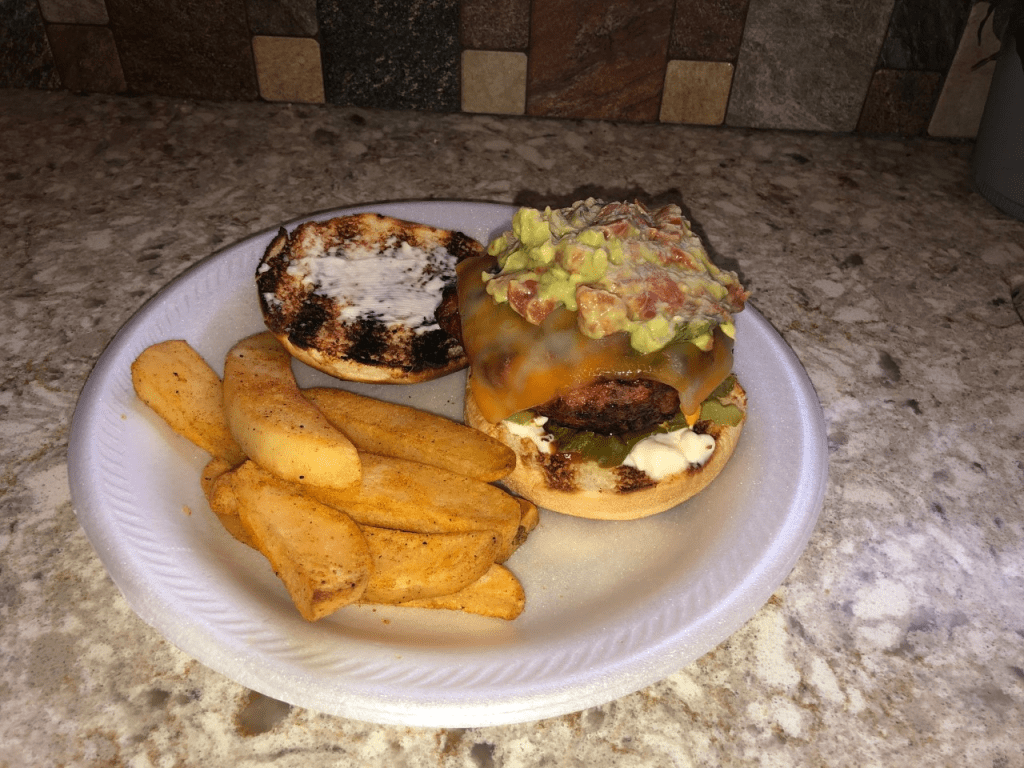 Holy Guacamole is this the most heavenly burger ever! My mom made burgers on the grill. They were a mix of ground turkey and Angus Beef. I added cheese, pickles, mayo, mustard and guacamole. The burger was moist, juicy and tender. The guacamole was light and not too spicy. The pickles rounded it out with a great crunch. And, my dad is the best guacamole maker ever!!! Remember, toast your burger bun and have some hand-cut fries on the side for a perfect meal!