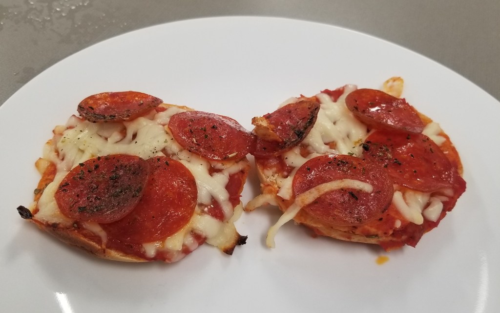 My classmates and I worked as a team to make this recipe. Maria, our occupational therapist, led the group. We laid out the bagels after cutting them in the bagel slicer. Next, we put a thick layer of pizza sauce on each half of the bagel. After that, we used shredded mozzarella to cover the pizza sauce. Then, we added 4 slices of pepperoni to each side of the bagel. Finally, we added a sprinkle of Italian seasoning to the top of each slice. The bagels cooked in the oven at 425 degrees for 5 – 10 minutes. Once we ate them, they tasted like real pizza. The cheese melted nicely and was ooey-gooey goodness. The Italian seasoning gave it an authentic taste. The pepperoni had the right amount of spiciness to give it some zing! I recommend pizza bagels for a party, a snack or a meal because they are quick and easy to make, and they taste delicious.